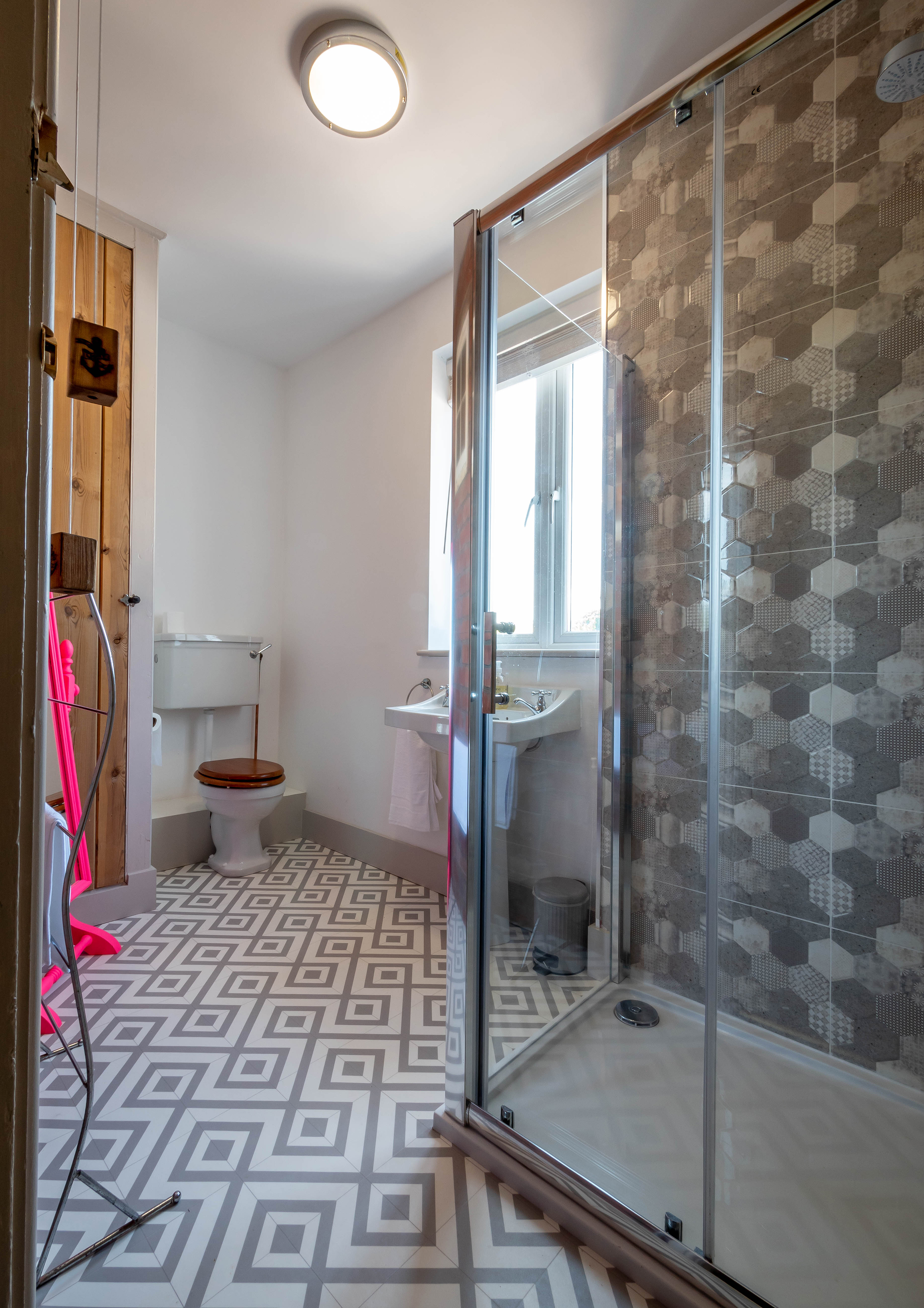 Bathroom featuring a hexagonal tile wall and walk in shower holiday accommodation Monmouthshire www.bhhl.co.uk -